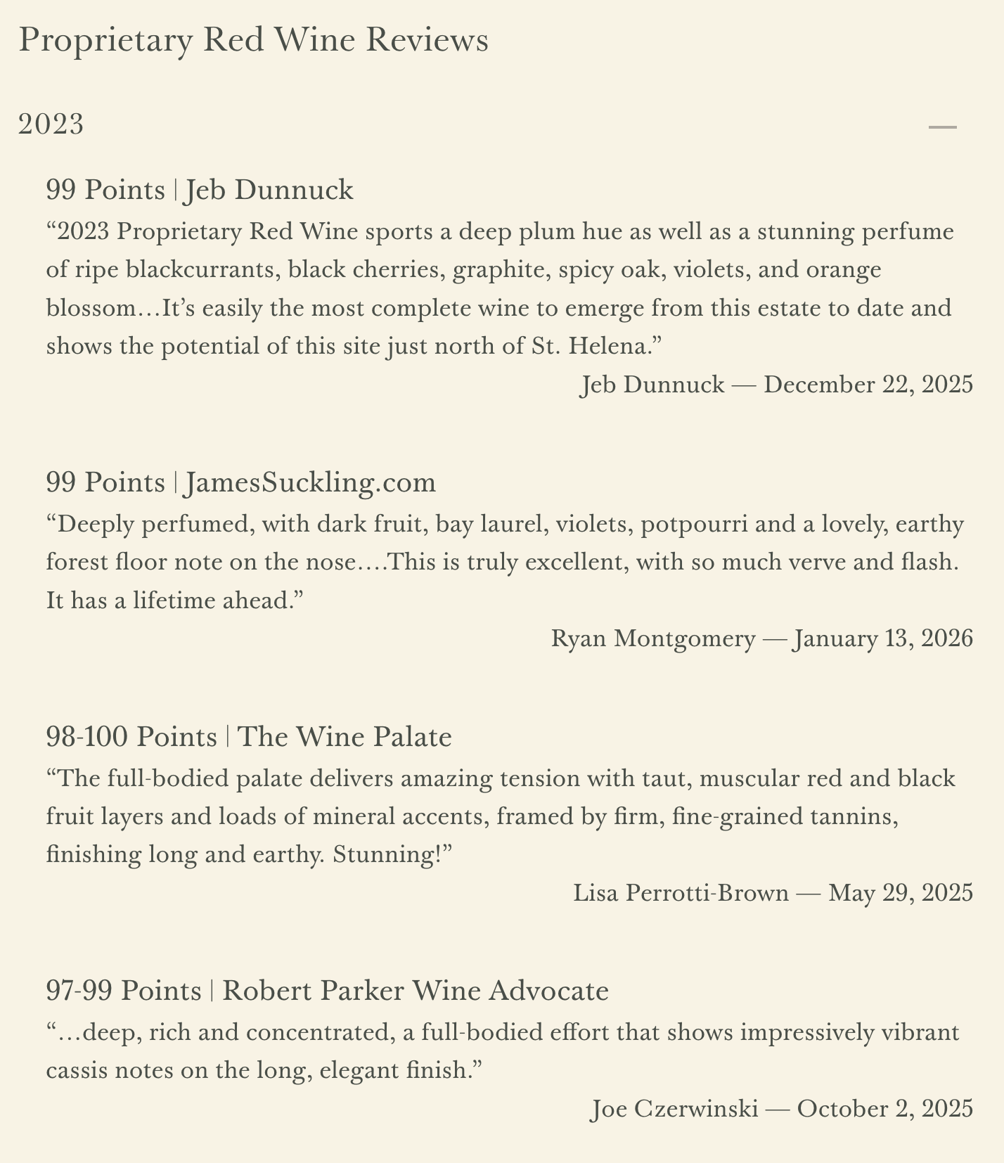 Press THE WINE PALATE THE WINE PALATE THE WINE PALATE FORBES - CULT WINES & FOOD PAIRINGS WINE SPECTATOR JAMES SUCKLING WINE SPECTATOR FORBES BERGMAN CRITIC SCORES